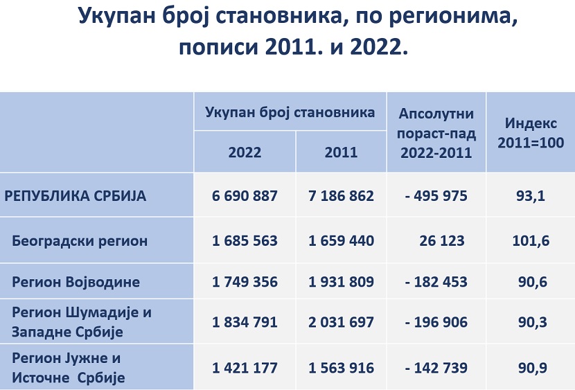 Smanjenje broja stanovnika zabeleženo je u svim regionima (za oko 10 procenata), osim u Beogradskom regionu gde je broj stanovnika povećan za oko 1,6 odsto.